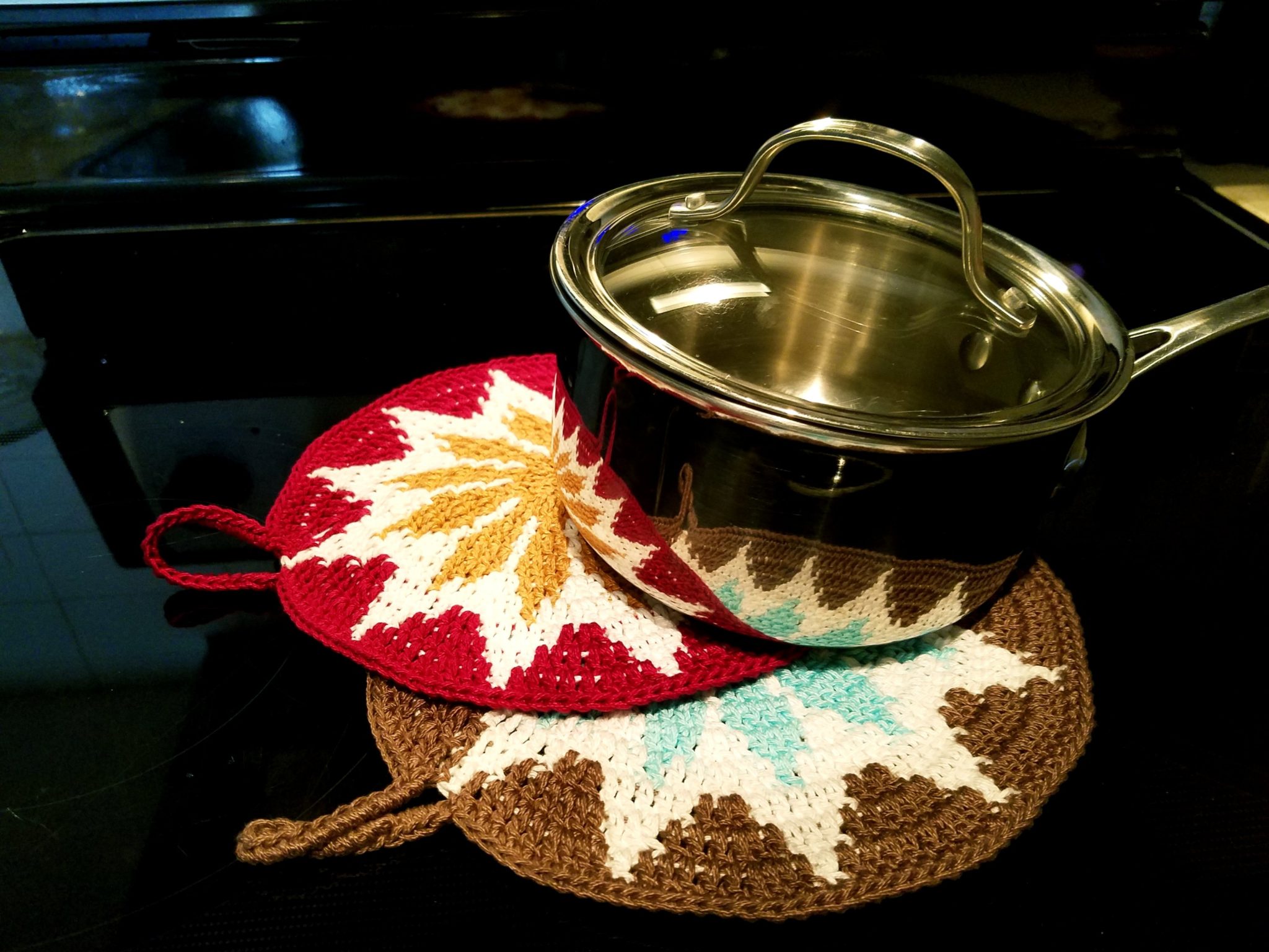 I use Lion Brand 24/7 cotton, you will need 1 skein of three different colors. Crochet hook size 3.25 mm. Potholder measures about 8.5 inches in diameter.