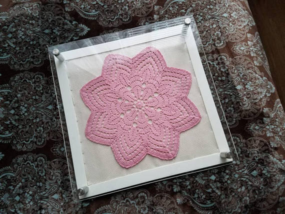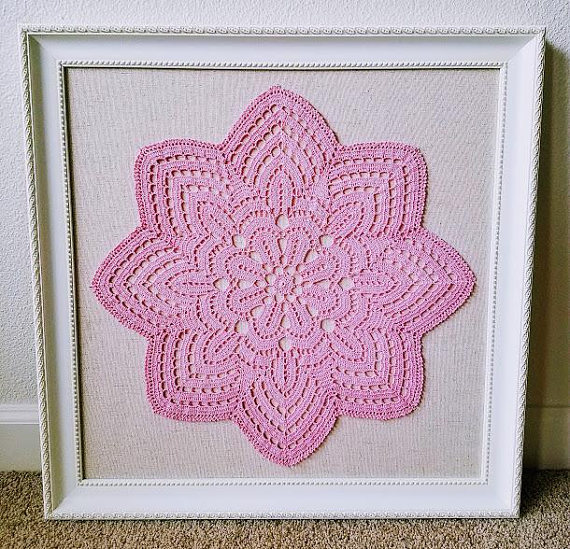 I like the idea of displaying doilies inside picture frame to show a different perspective of how a piece of crochet can be used in home decor.